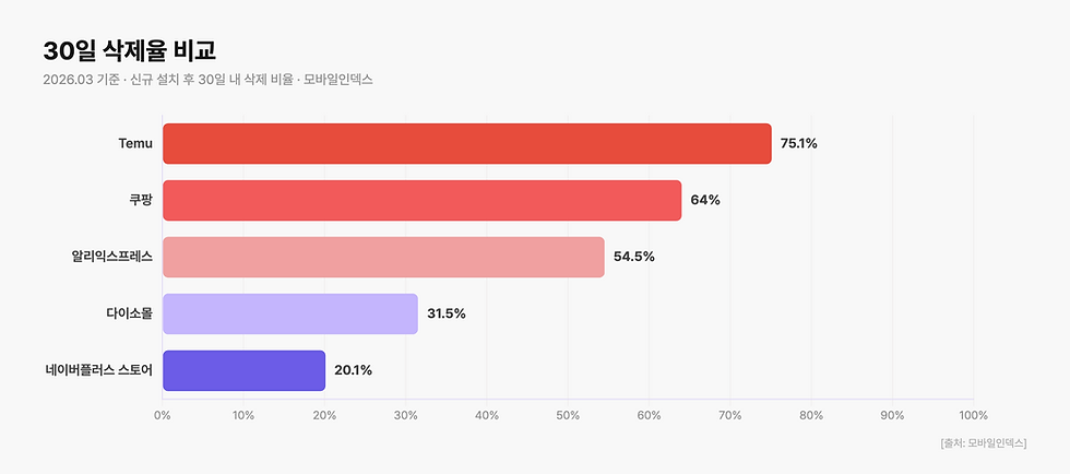 30일 삭제율은 Temu 75.1%, 쿠팡 64.0%, 알리 54.5%, 다이소몰 31.5%, 네이버플러스 스토어 20.1%. Temu는 설치자 4명 중 3명이 한 달 안에 앱을 지운다는 얘기입니다. 공격적인 마케팅으로 유입은 만들지만 정작 붙잡지는 못하는 구조입니다.