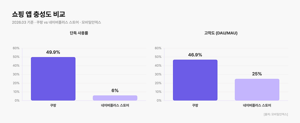 고착도(DAU/MAU)는 쿠팡 46.9%, 네이버플러스 스토어 25.0%. 쿠팡은 사용자 절반이 매일 앱을 여는데, 네이버플러스 스토어는 4명 중 1명에 그칩니다. 균열을 내고 있는 건 맞지만, 쿠팡의 자리를 빼앗으려면 아직 갈 길이 멉니다.