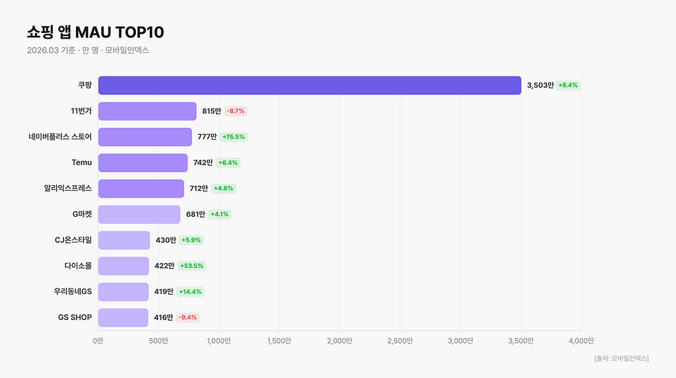1위 쿠팡(3,503만)과 2위 11번가(815만)의 격차는 4.3배. 쿠팡의 지배력은 여전히 압도적입니다.