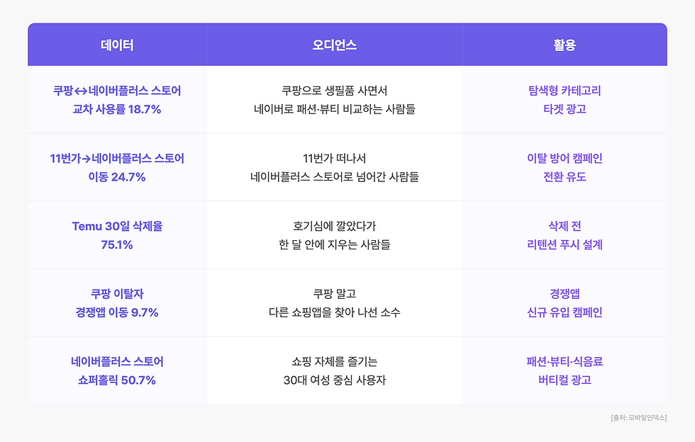 위 표처럼, 교차 사용률·이탈 경로·페르소나·관심 업종 데이터는 그 자체로 광고 타겟이 됩니다.