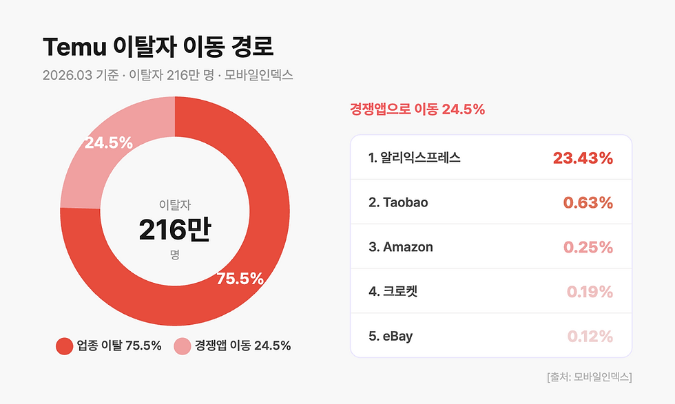 Temu의 이탈 데이터를 보면 이 둔화의 구조가 더 선명해집니다. 이탈자 216만 명 중 75.5%가 업종 자체를 떠났습니다. 경쟁앱(알리)으로 간 23.4%를 빼면, 나머지는 해외직구 쇼핑 자체를 그만둔 셈입니다.