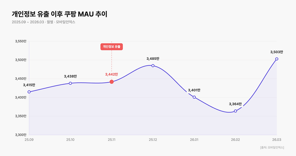 사고 직후인 12월에는 연말 쇼핑 시즌 효과로 소폭 올랐지만(3,485만), 1~2월 두 달 연속 하락하며(3,401만 → 3,364만) 사고의 여파가 드러나는 듯했습니다. 그런데 3월에 3,503만으로 반등하며 사고 이전 수준을 회복했습니다.