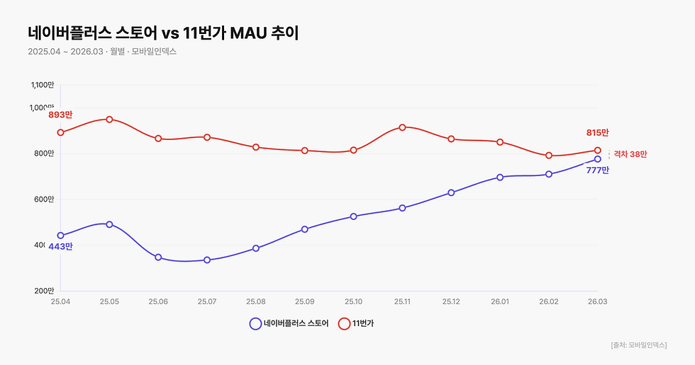 11번가와의 격차는 2025년 4월 450만에서 2026년 3월 38만으로 좁혀졌습니다. MoM 성장률은 네이버플러스 스토어 +9.3%, 11번가 +2.8%.