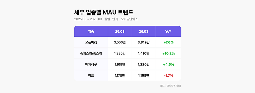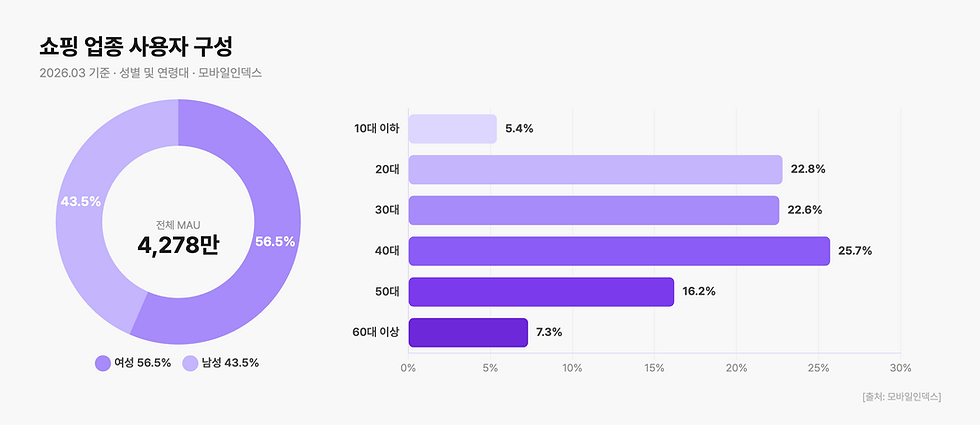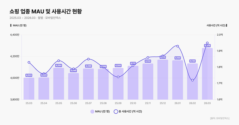 2026년 3월 기준 쇼핑 업종 전체 MAU는 4,278만 명, 역대 최고치입니다.