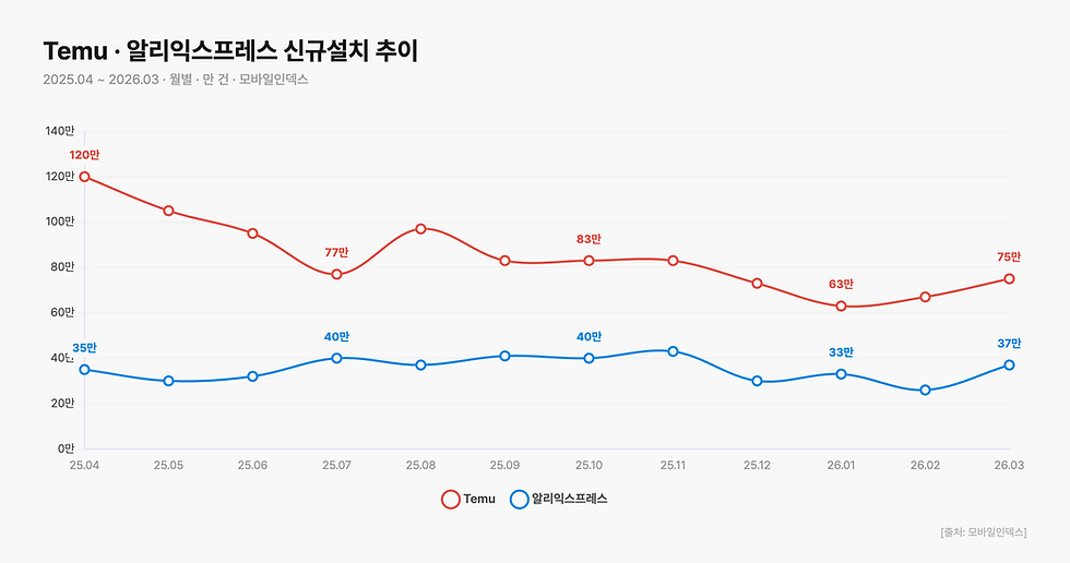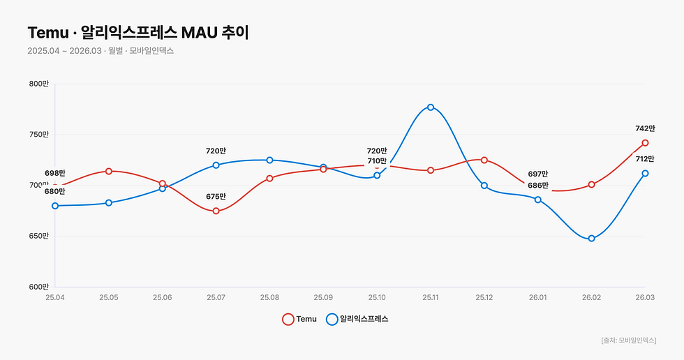 변화는 알리익스프레스 쪽이 더 뚜렷합니다. 2025년 11월 777만으로 정점을 찍은 뒤 등락을 반복했고, 2026년 2월에는 648만까지 빠졌다가 3월에 712만으로 반등했지만 피크 대비로는 여전히 낮습니다.