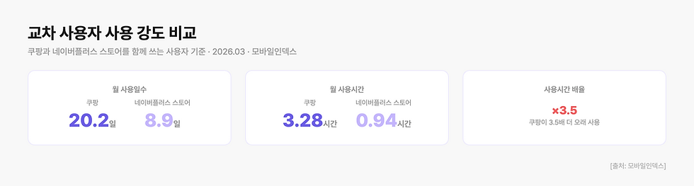 교차 사용자가 두 앱을 쓰는 강도는 크게 다릅니다. 쿠팡은 월 20.2일, 3.28시간을 쓰는데 네이버플러스 스토어는 8.9일, 0.94시간을 씁니다. 사용시간 기준으로 3.5배 차이입니다.