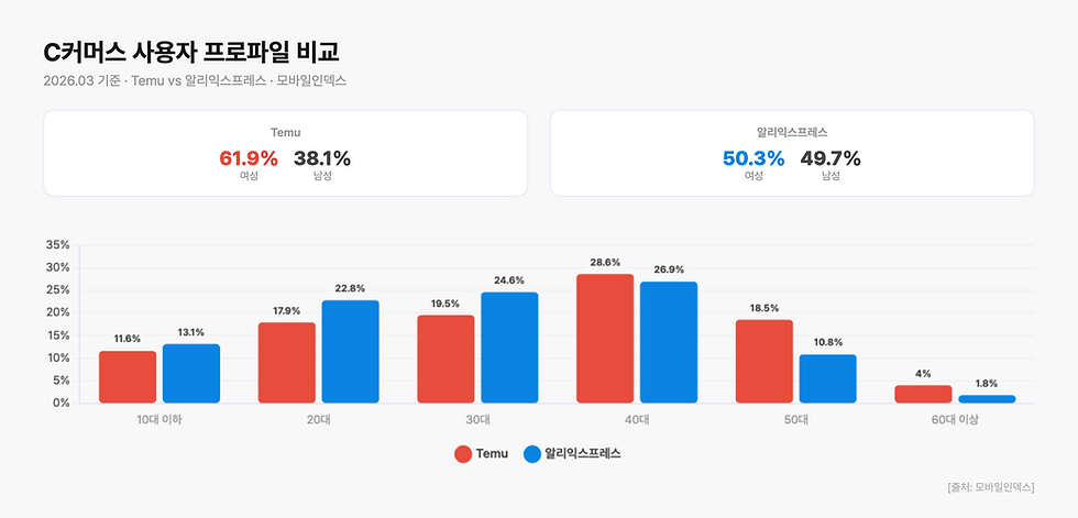 사용자 프로파일도 참고할 만합니다. Temu는 여성 61.9%, 40대(28.6%) 비중이 가장 높고, 알리익스프레스는 여성 50.3%로 쇼핑 앱 중 유일하게 성비가 5:5에 가깝습니다. 알리의 남성 비중이 높은 건 전자기기·공구 같은 카테고리를 해외직구로 사는 패턴이 반영된 결과입니다.