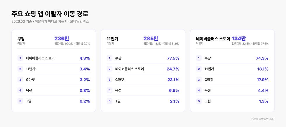 쿠팡의 지배력은 여전히 단단합니다. 다만 9.7%의 경쟁앱 이탈 안에서 전에는 없던 변화가 감지됩니다. 이 이야기는 세 번째 주제에서 이어가겠습니다.