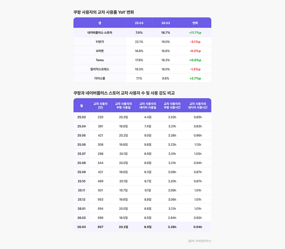 2025년 3월, 쿠팡 사용자 중 네이버플러스 스토어를 함께 쓰는 비율은 7.0%였습니다. 2026년 3월, 이 수치가 18.7%까지 올랐습니다. 1년 만에 +11.7%p 증가한 건데, 같은 기간 다른 앱들의 교차 사용률은 정체하거나 오히려 떨어졌습니다.