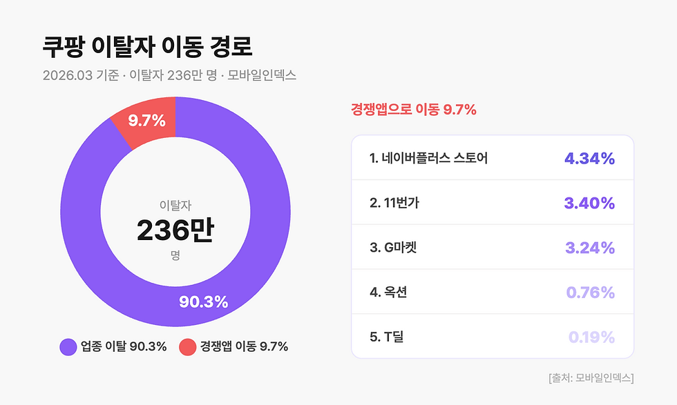 이탈자 236만 명 중 90.3%가 업종 자체를 떠났고, 경쟁앱으로 넘어간 비율은 9.7%에 불과합니다. 쿠팡을 떠나는 이유가 "다른 앱이 더 좋아서"가 아니라 "쇼핑할 일이 없어서"인 셈입니다.