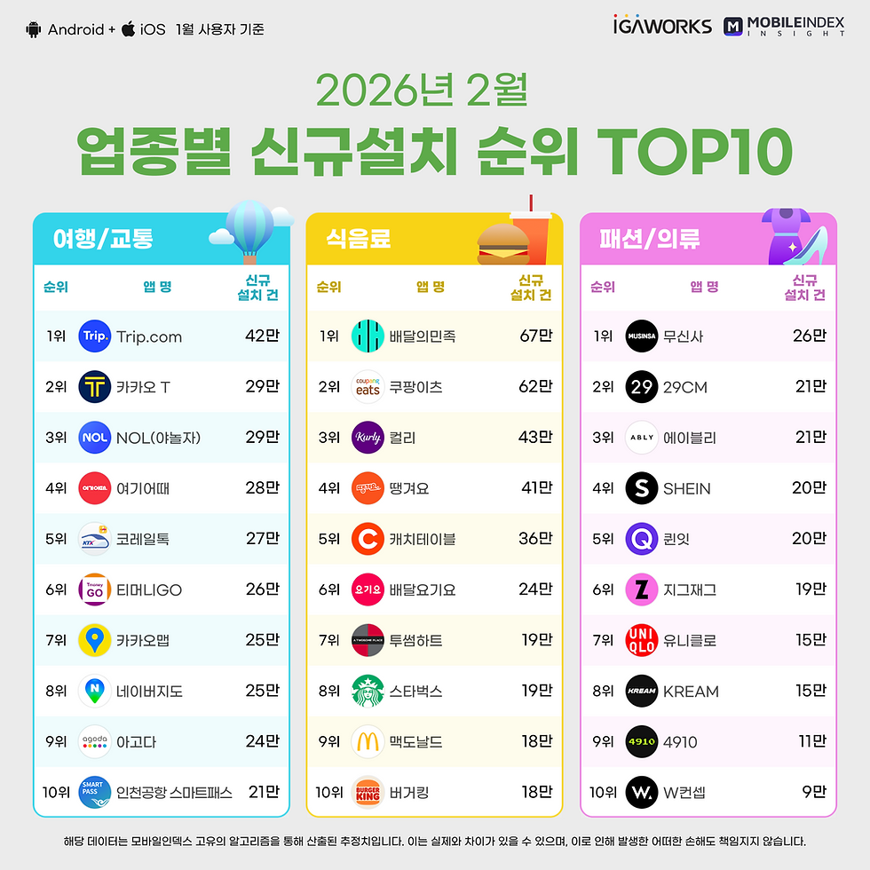 다가오는 2월에는 각 업종의 이용 행태가 어떻게 변화하고, 또 어떤 새로운 앱들이 순위에 이름을 올릴지 기대됩니다.